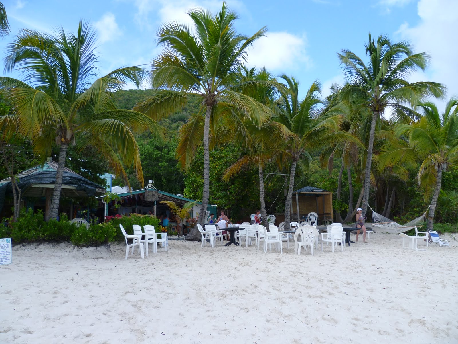 He asks if I want to go see the beach and I think he means the one out front so say yes, but then he walks away from that beach and to the car. We get in and he drives over the hill to where Ivan's Stress Free Bar and Campground is. When we get to the beach, I can't believe how gorgeous it is. The color of the water here is unmatched in the rest of the BVI that I have seen. And it's so clear you can see the bottom no matter how deep it is, and it's all sand. We get in the water and just float about for over an hour. It's pure heaven. We meet another woman in the water who is from one of the charter boats. She's really friendly and when we get out of the water to go sit on the beach, we join her friends and have some good laughs. What a fun bunch!!
